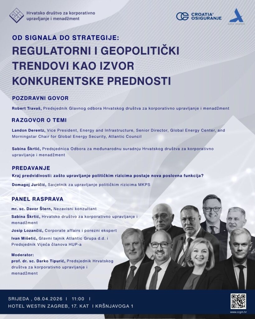 The business conference “From Signal to Strategy: Regulatory and Geopolitical Trends as a Source of Competitive Advantage” will be held on Wednesday, April 8 at 11:00 AM, at the Westin Hotel Zagreb, 17th floor (Kršnjavoga 1, Zagreb).