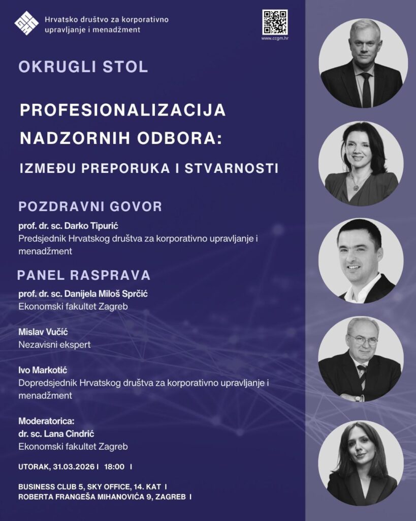 Croatian Corporate Governance and Management Society is organizing a roundtable titled “Professionalization of Supervisory Boards: Between Recommendations and Reality”, with the aim of opening an expert discussion on one of the most important topics in modern corporate governance.
